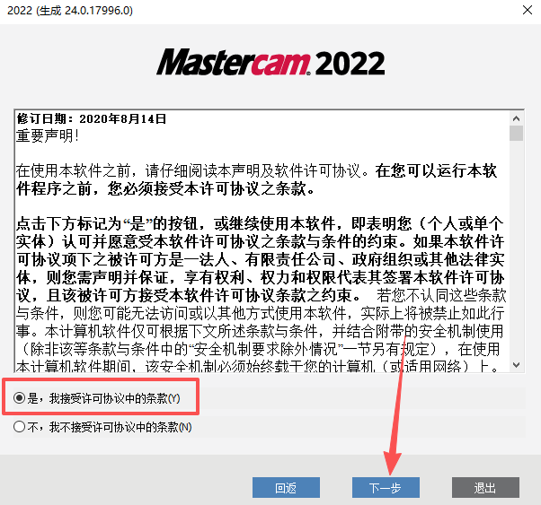 8、选择【是,我接受许可协议中的条款】,然后点击【下一步】。