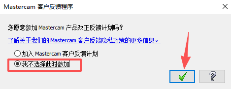 24、在桌面双击【Mastercam 2022】图标启动软件,选择【我不选择此时参加】,然后点击【√】。