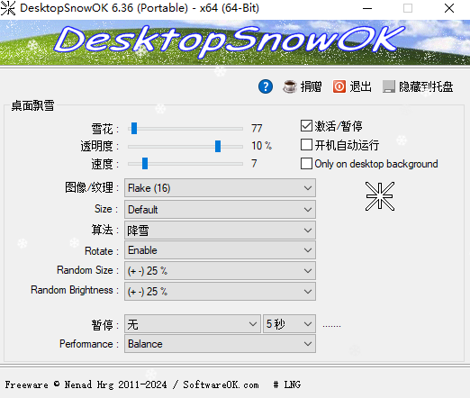 DesktopSnowOK可在你的桌面上呈现雪花纷飞的效果,如果你觉得系统默认的设定不够好的话,可以在不影响桌面使用的情况下,调整雪花的数量,形状,颜色、大小和透明度等等,有需要的小伙伴不妨体验试一试!
