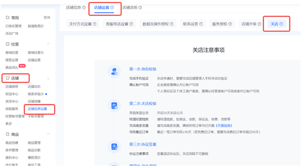 关店包含以下几个步骤:申请关店、确认身份、达成关店条件、签署协议、资金退回。