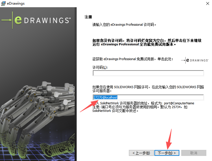 3、网络许可服务器【27270@localhost】,点击【下一步】。