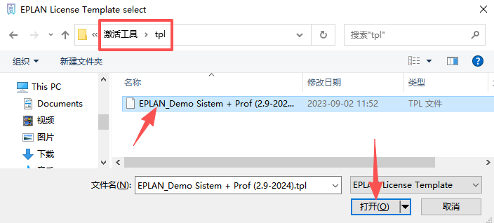 16、选中【激活工具-TPL】文件夹下的【EPLAN_Demo Sistem + Prof (2.9-2024).tpl】文件,点击【打开】。