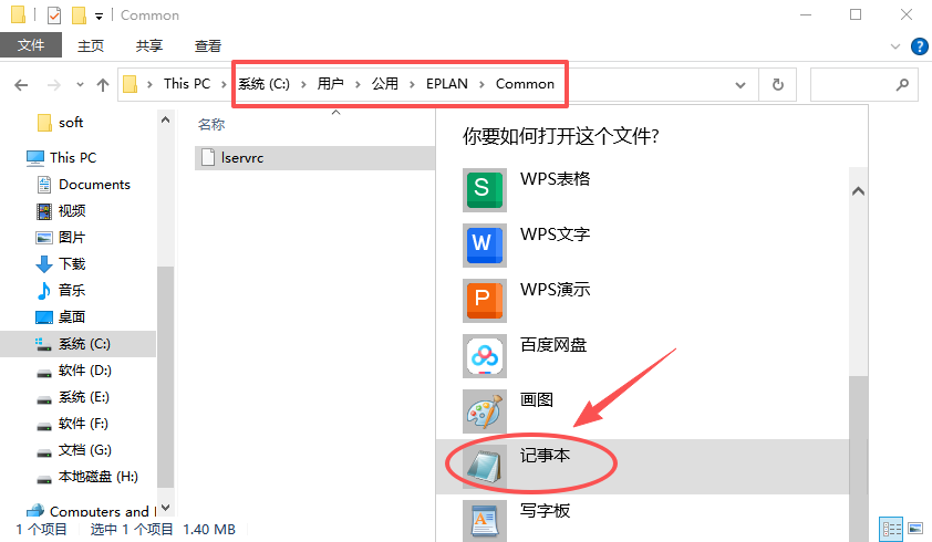 20、依次打开路径:【C:\Users或用户\Public或公用\EPLAN\Common】,选中【lservrc】文件,选择用【记事本】打开。