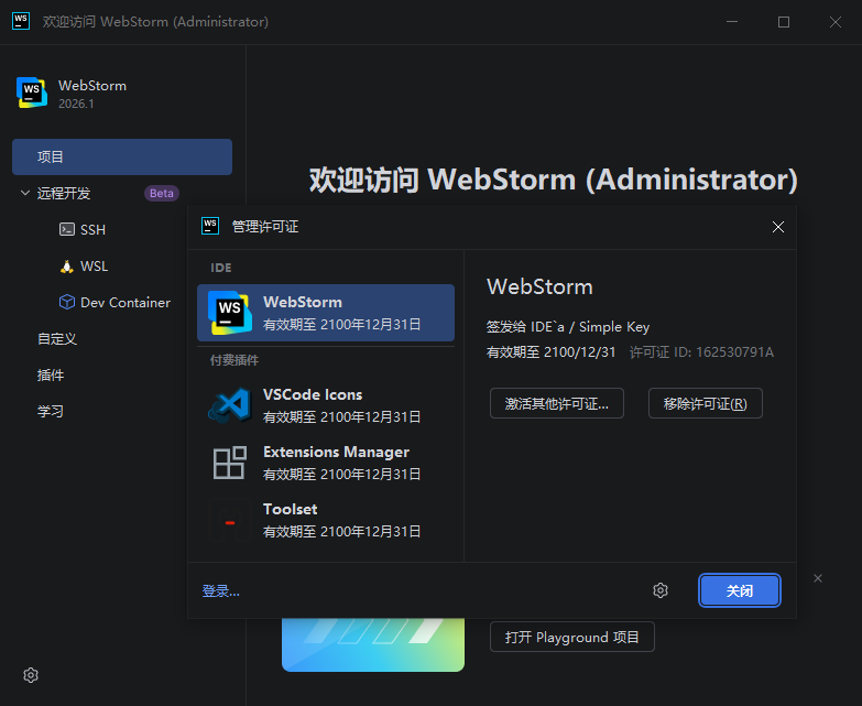 9、如下图所示,WebStorm 2026安装激活成功,用户可无限制免费使用其内所有功能。