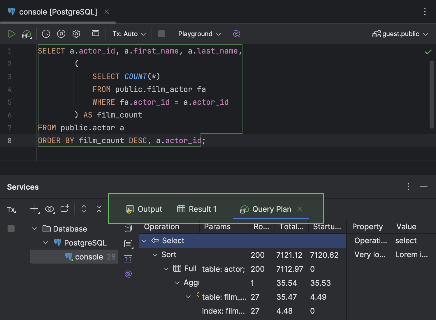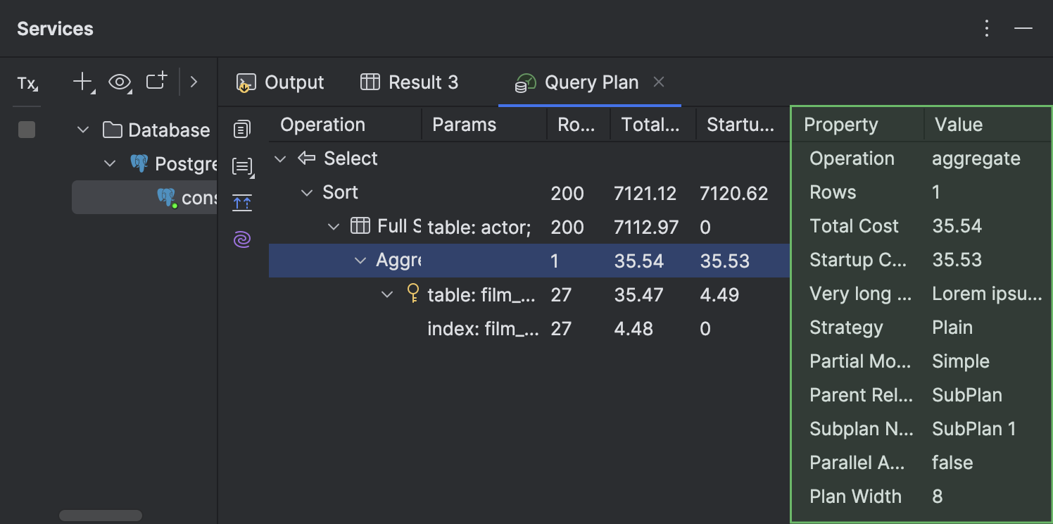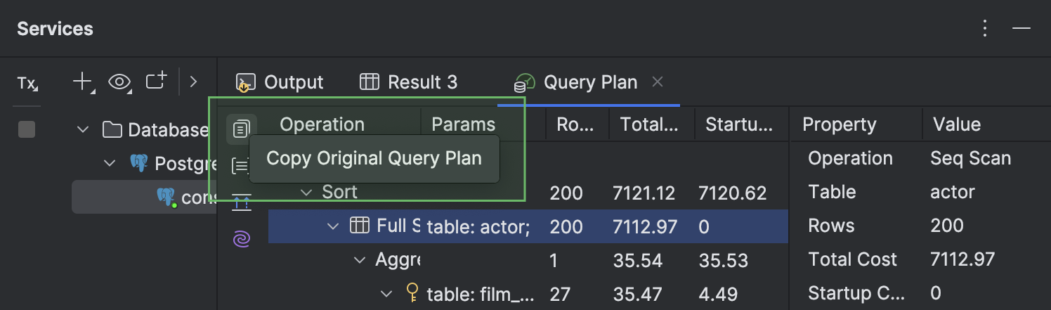● 在 Services(服务)工具窗口中,显示计划的 Query Plan(查询计划)标签页已移至与 Output(输出)和 Result(结果)标签页相同的级别。 该标签页还采用新图标。