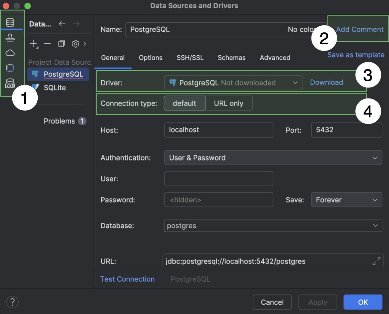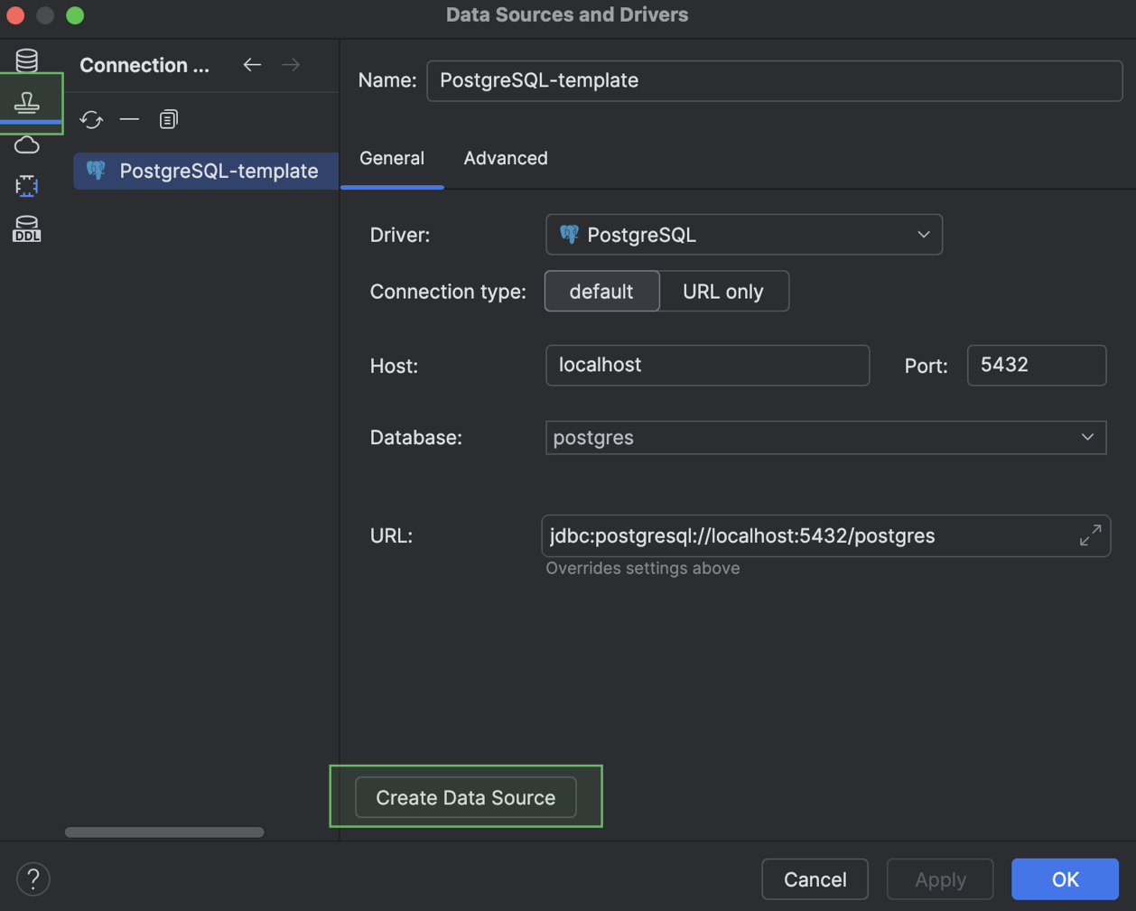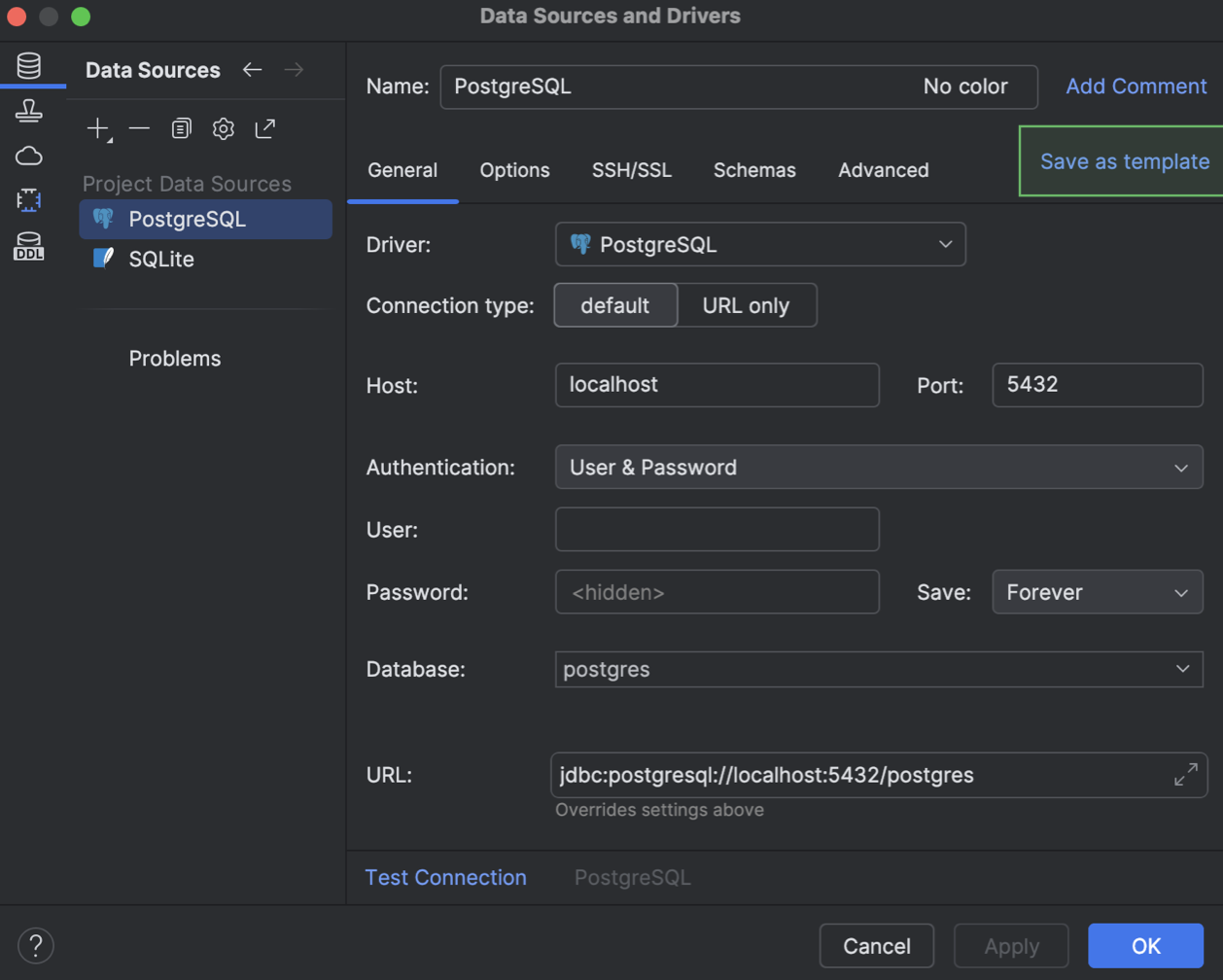 您可以在 Data Source and Drivers(数据源和驱动程序)对话框中创建模板。 在 Data Sources(数据源)标签页上,选择创建模板要采用的数据源,然后点击 Save as template(另存为模板)。