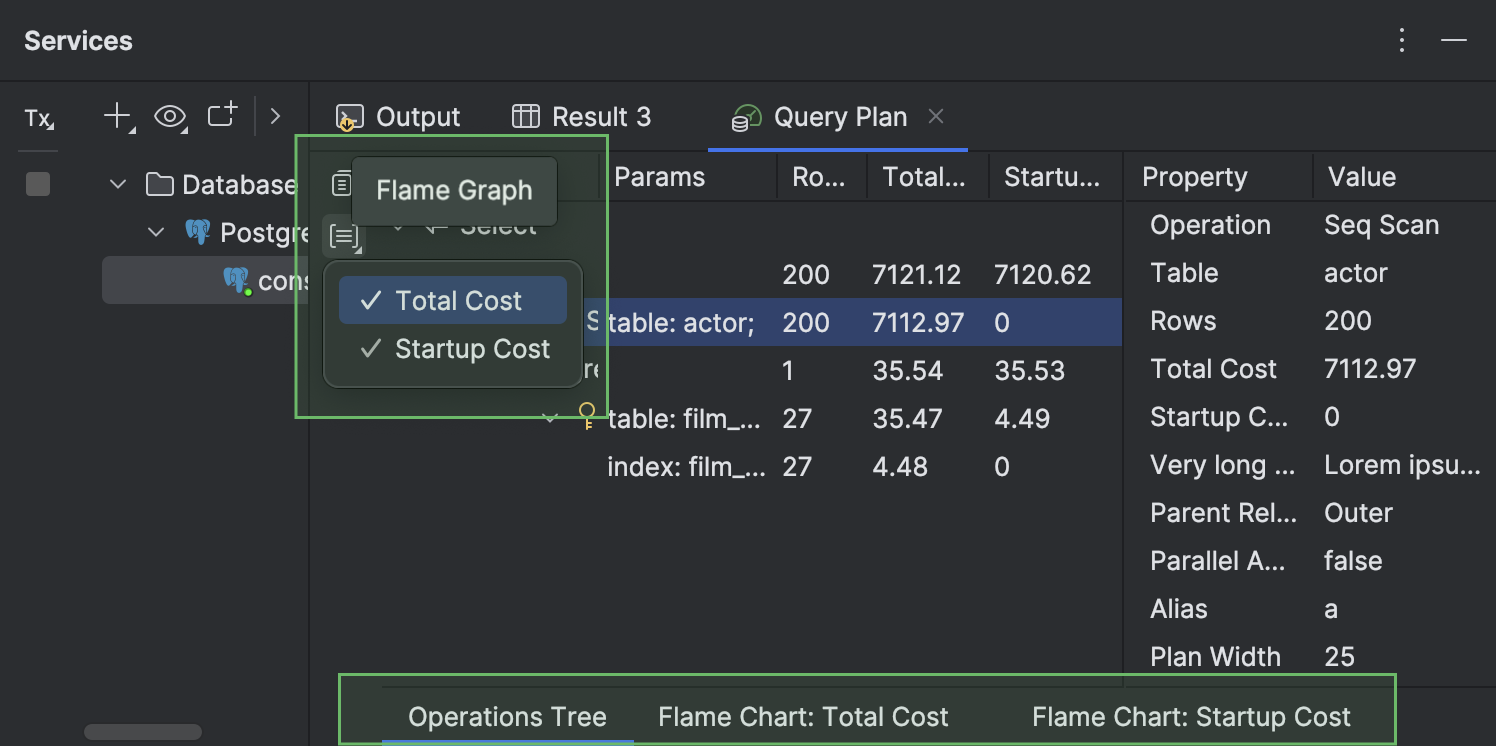 ● 可用于查询计划的不同视图会显示在单独的子标签页中。 这些内部标签页位于 Query Plan(查询计划)标签页的底部。 这些标签页默认隐藏,仅在打开多个标签页时显示。 要打开 Total Cost(总成本)或 Startup Cost(启动成本)标签页,请点击左侧工具栏上的 Flame Graph(火焰图),然后选择所需的视图。