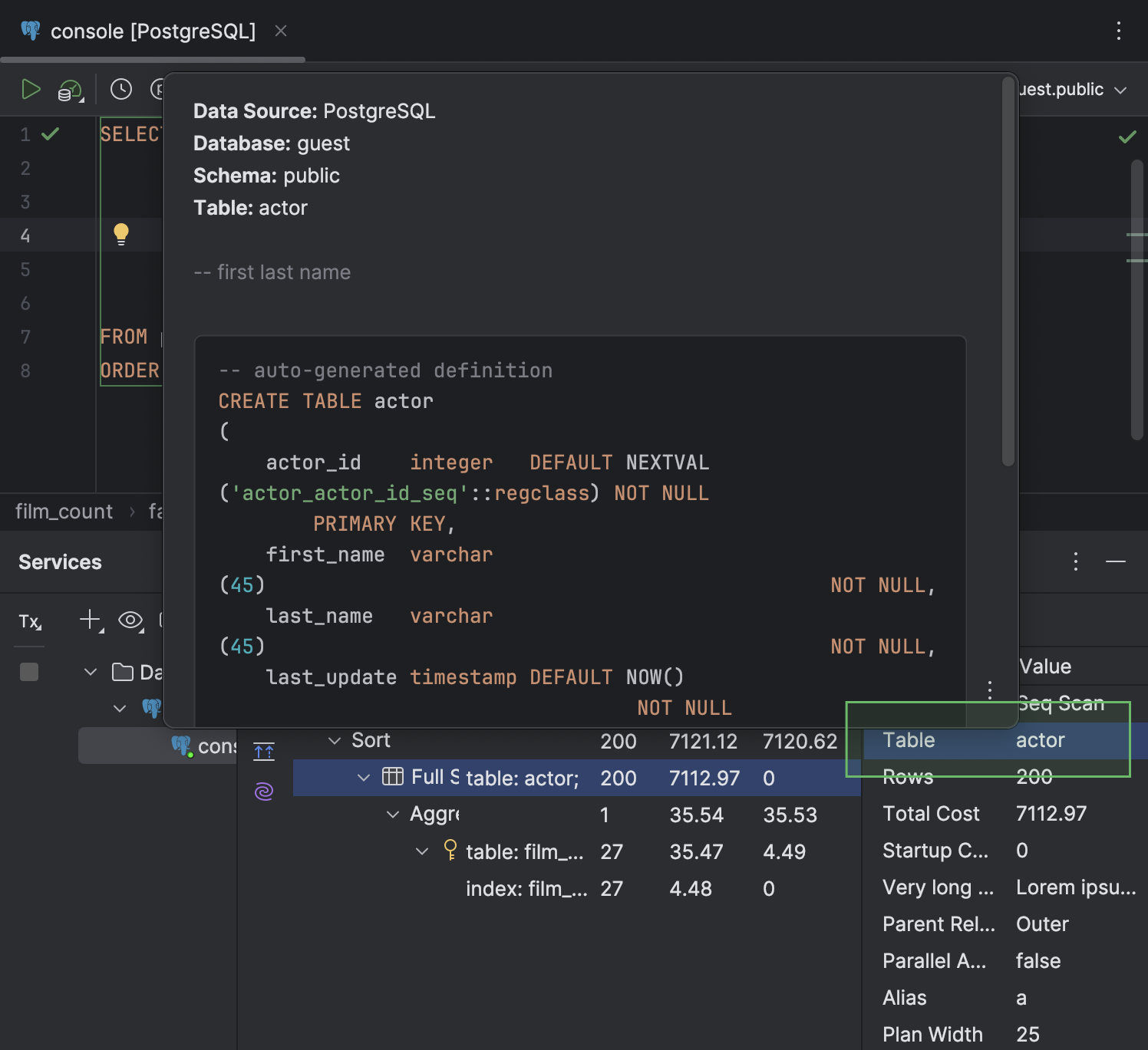 DataGrip可以正确解析SQL代码中的所有引用,并帮助您重构它们。当您重命名变量或别名时,它将在整个文件中更新其用法。当您从查询重命名对它们的引用时,数据库中的实际表名将被更新。甚至还可以预览其他视图,存储过程和函数中的表/视图。