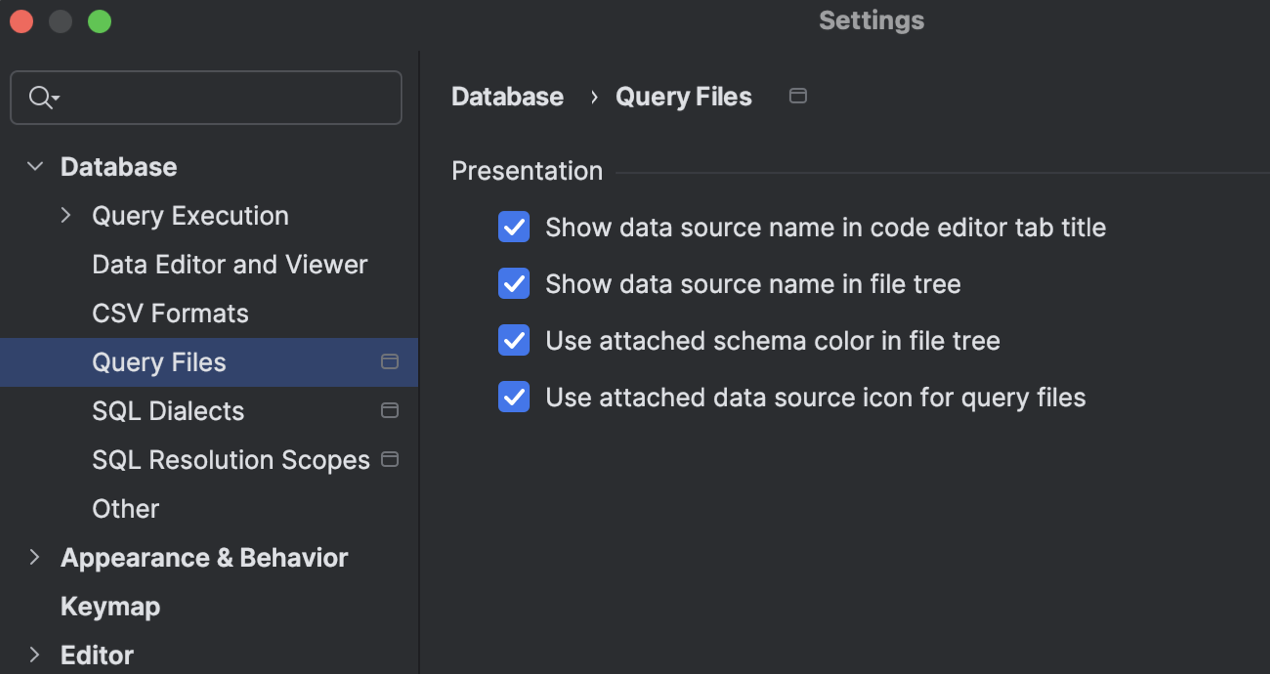 不同的任务需要显示不同的信息。 我们添加了一些设置,以确保查询文件的展示方式能为您的特定用例提供适当的信息。 您可以使用这些设置来切换是否显示数据源名称、应用架构颜色,以及将附加数据源的图标用于查询文件。
