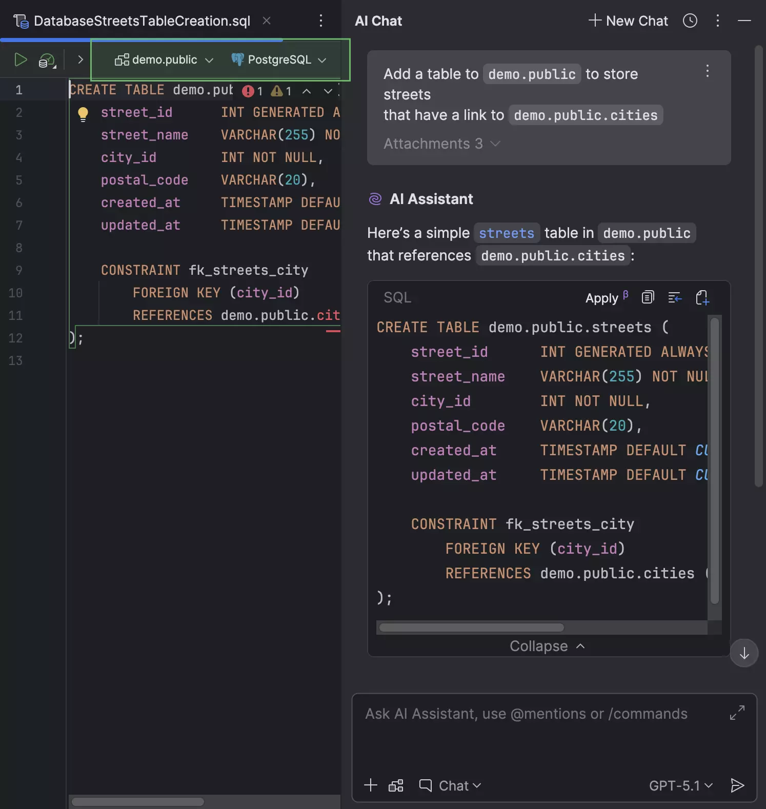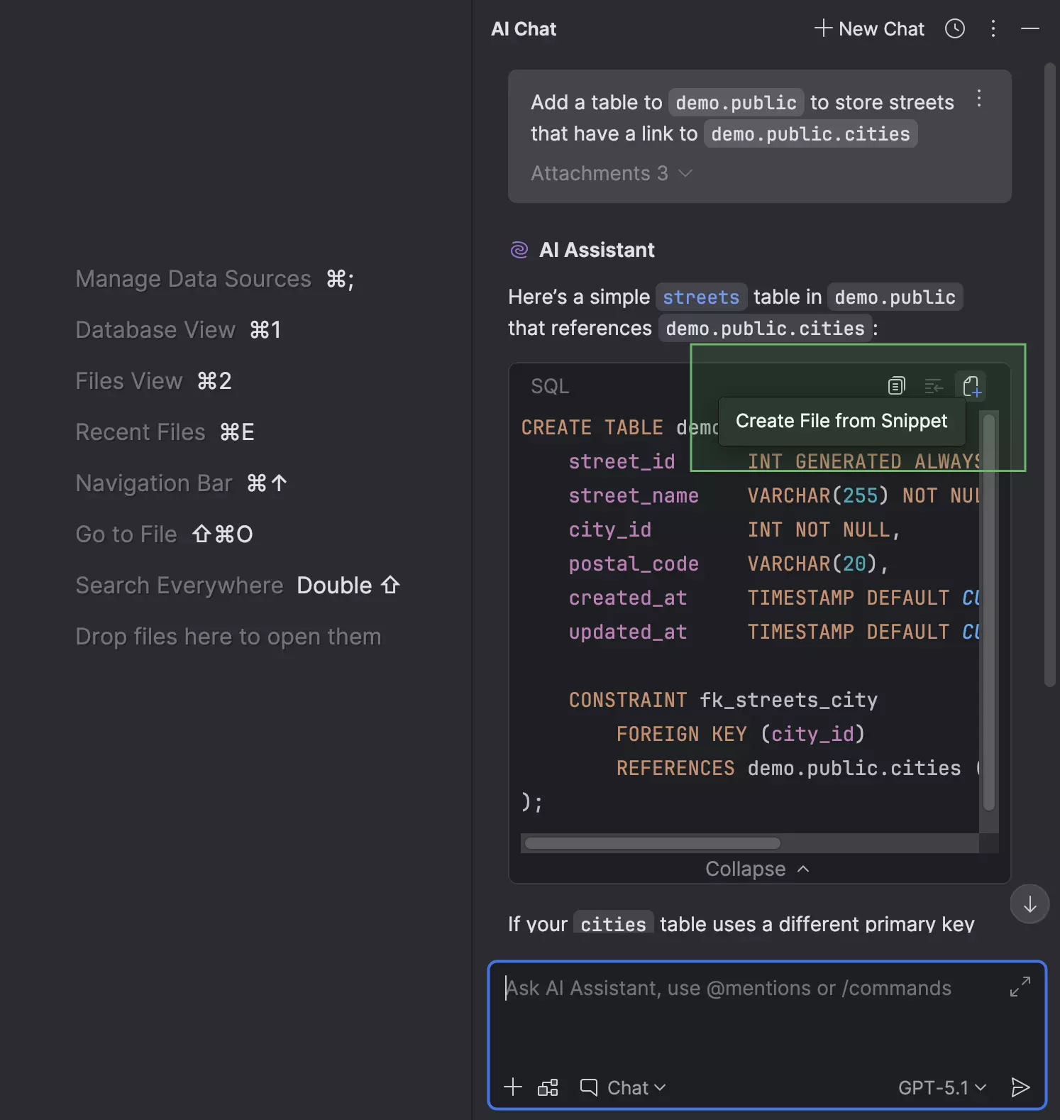 如果在聊天中提供了与 SQL 方言、数据源或架构相关的任何上下文,则无需附加数据源或架构,也无需设置方言,因为 DataGrip 会自动完成这些操作。 同样,如果您向 AI Assistant 询问有关已附加数据源的文件的问题,DataGrip 会将该数据源附加到新创建的文件中。