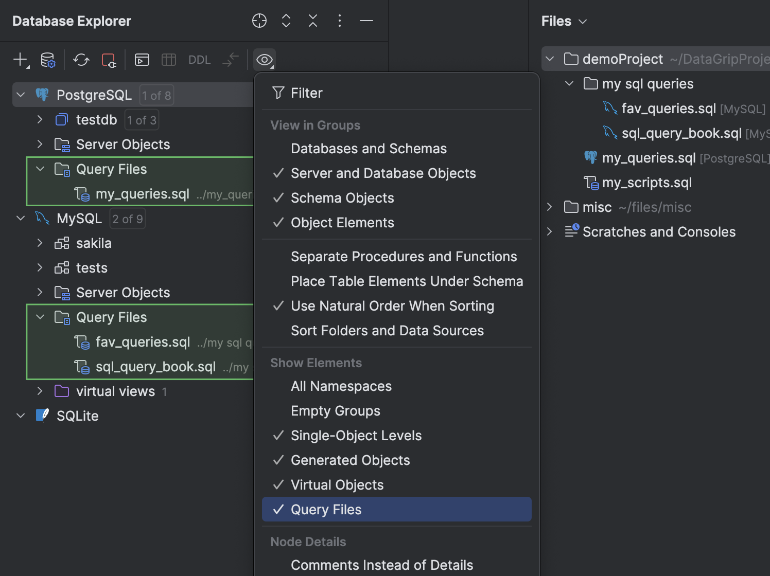 您现在可以在数据库资源管理器中访问您的查询文件。 我们添加了 Query Files(查询文件)文件夹,这些文件夹会显示在每个数据源节点下。 要切换此文件夹的可见性,请点击工具窗口工具栏上的 View Options(视图选项),然后选择或取消选择 Query Files(查询文件)选项。