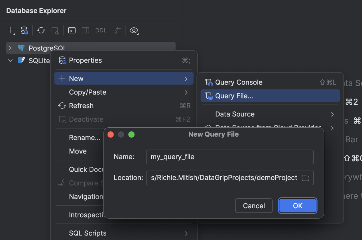 要创建新的查询文件,请右键点击数据源,并选择 New | Query File(新建 | 查询文件),或者按 Shift+Cmd+J (macOS) 或 Ctrl+Alt+Shift+Q (Windows/Linux)。 然后,在 New Query File(新建查询文件)对话框中指定文件名以及文件存储目录。 要将文件存储在当前项目中并将其与项目关联,请指定当前项目目录或其子目录之一。