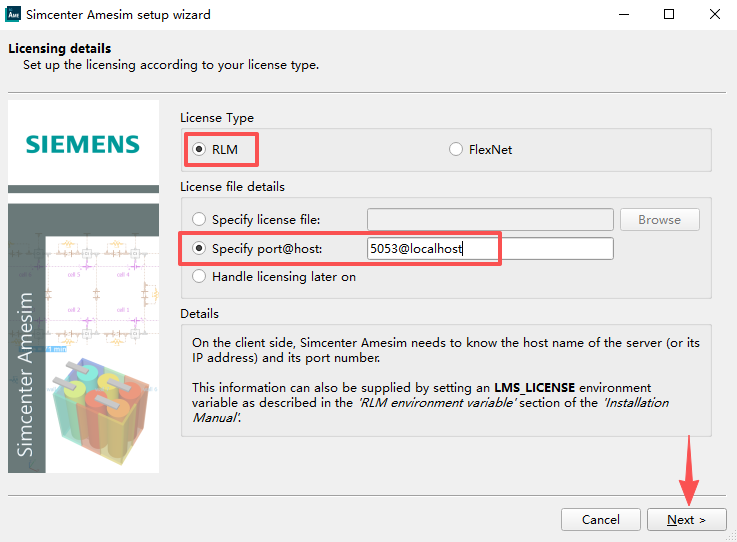 16、License type选择【RLM】,在Specify port@host输入【5053@localhost】,点击【Next】。