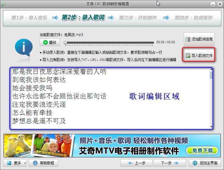 导入好歌曲文件后,点击“下一步”按钮进入录入歌词的步骤。