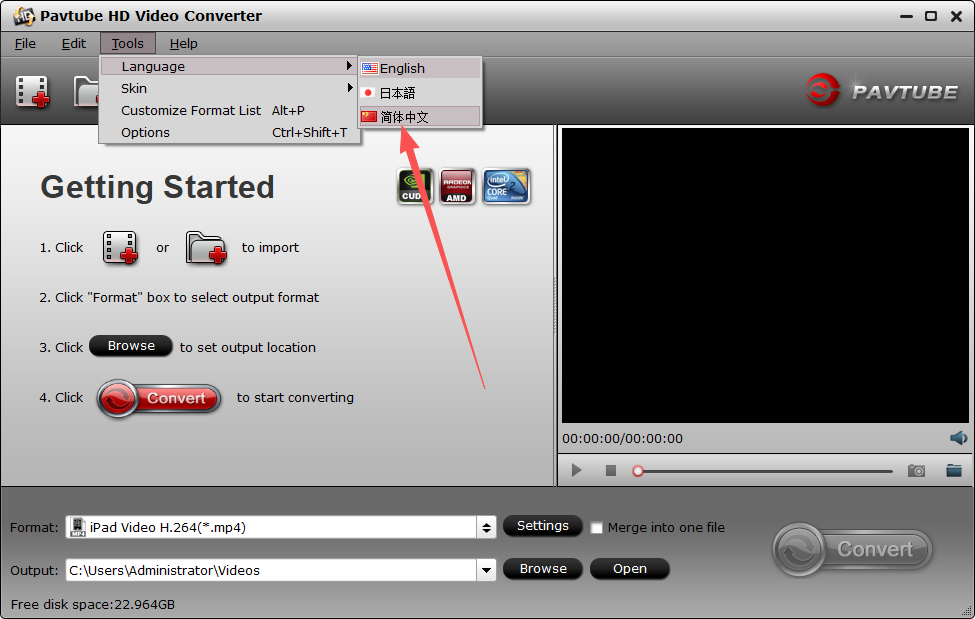 1、在Pavtube HD Video Converter软件主界面,点击Tools下的Language。