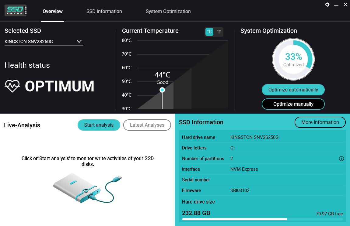 获取有关您的驱动器和制造商的信息。SSD Fresh 2019显示适用于计算机中安装的硬盘驱动器的一般信息。您可以看到例如存储容量和已占用的空间。