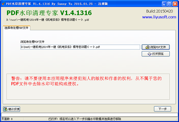 选择文件后,可以点击“打开预览”按钮查看PDF文件内容,确认是要做去除水印处理的PDF文件后,点击“下一步”按钮。