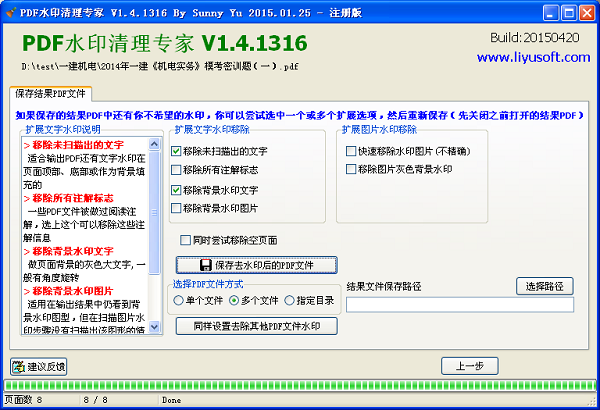 这个选项会打开一个对话框让你选择一个目录,然后使用相同的设置批量处理这个目录下的所有PDF文件(包括子目录下得PDF文件)。如果你指定了保存结果的路径,处理后得文件会以同样的文件名保存到目标目录下,否则将会将结果文件自动添加后缀Removed-Output保存在原目录下。