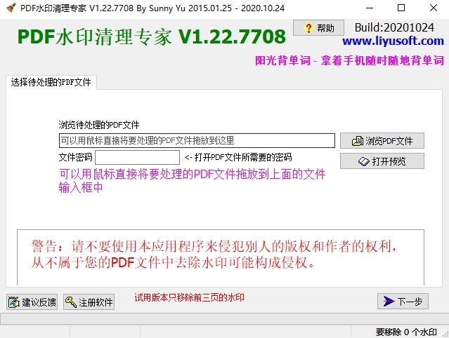 步骤1: 运行《PDF水印清理专家》,选择一个要做水印去除处理的PDF文件
