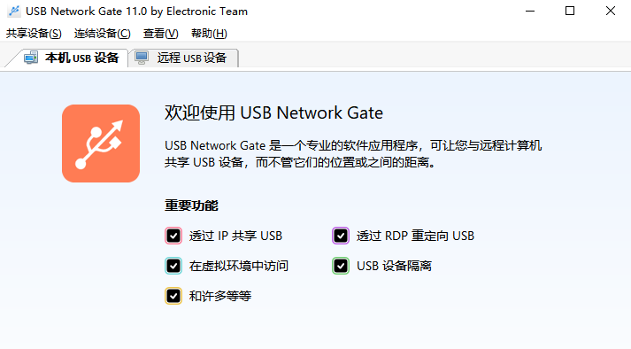 USB Network Gate可以在任何网络上运行,如局域网、广域网和互联网,并支持将USB设备连接至虚拟机,同时提供远程桌面连接功能,允许通过远程桌面访问本地USB设备,并实现多台计算机之间的数据传输与共享。总体而言,这款软件功能强大、易于使用,是一款实用的USB设备共享工具。