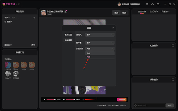 声卡用户需要点击“开始直播按钮”左侧的“小螺母图标”打开音频设置面板,在面板中关闭“系统音频”(防止伴侣和声卡同时采集系统音频导致回声等问题),关闭系统音频后就可以开始直播了(弹幕游戏主播需要接着往下看)