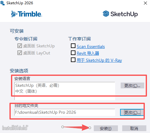 1、下载并解压得到SketchUp Pro 2026,双击运行安装程序,进入安装向导,选择安装语言和软件安装位置,完成后点击“安装”即可;