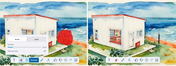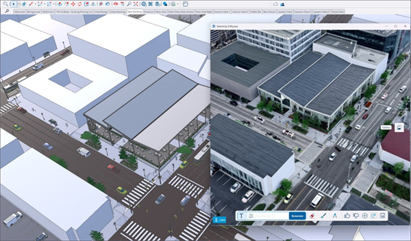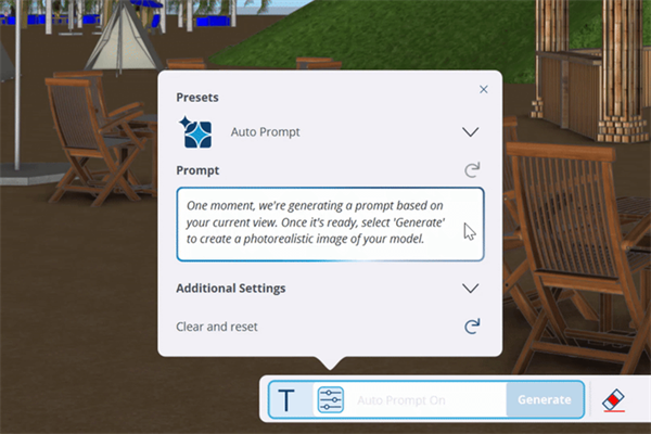 引入的全新自动提示预设模式,可自动生成详细描述SketchUp模型视口的提示文本。擦除工具用于消除图像瑕疵。绘画工具通过蒙版和提示语重新生成局部区域的图像。素描工具则利用手绘草图和提示语向图像添加元素。