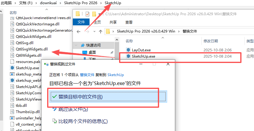 5、将激活补丁文件夹下的【SketchUp.exe】复制到安装位置SketchUp文件夹中,点击替换目标中的文件;