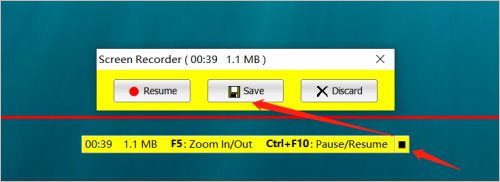 8、视频录制好后,再点击黄框最右侧的黑色按钮位置,再弹出的框里点击【save】即可保存录制的视频。