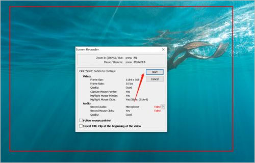 6、左击选择自己需要录制的区域,有效区域会显示红色框,划分好后,选择“start”即可开始录制视频。
