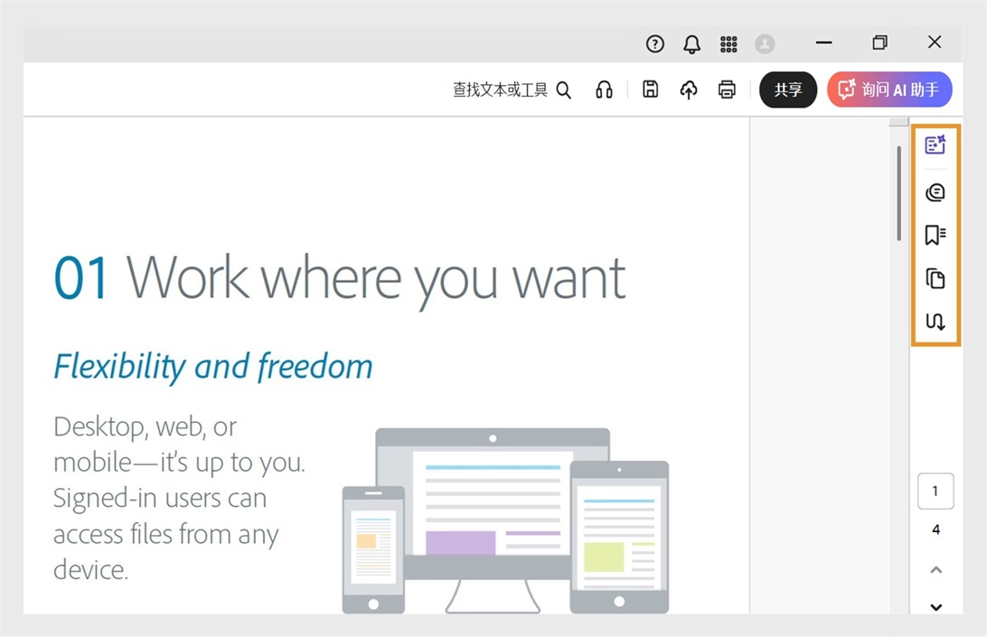 在 Acrobat 中打开文档即可访问“所有工具”菜单、“快速操作”工具栏和右侧面板。