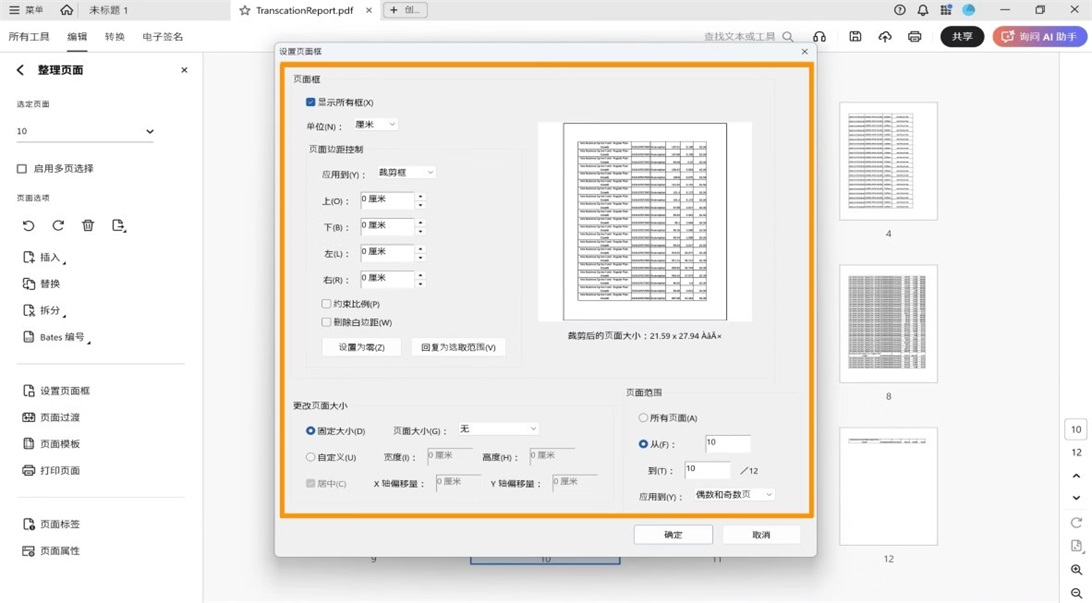 5、在设置页面框对话框中,根据需要修改以下设置: