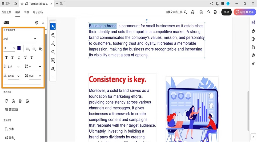 全局栏包括一些 PDF 工具,例如所有工具、编辑、转换、电子签名,以及文件操作,包括搜索、保存、打印和共享。
