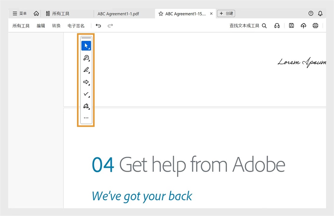 您可以从快速操作工具栏中选择或平移对象、添加注释、绘制形状、高亮显示文本、填写表单和签署文档。