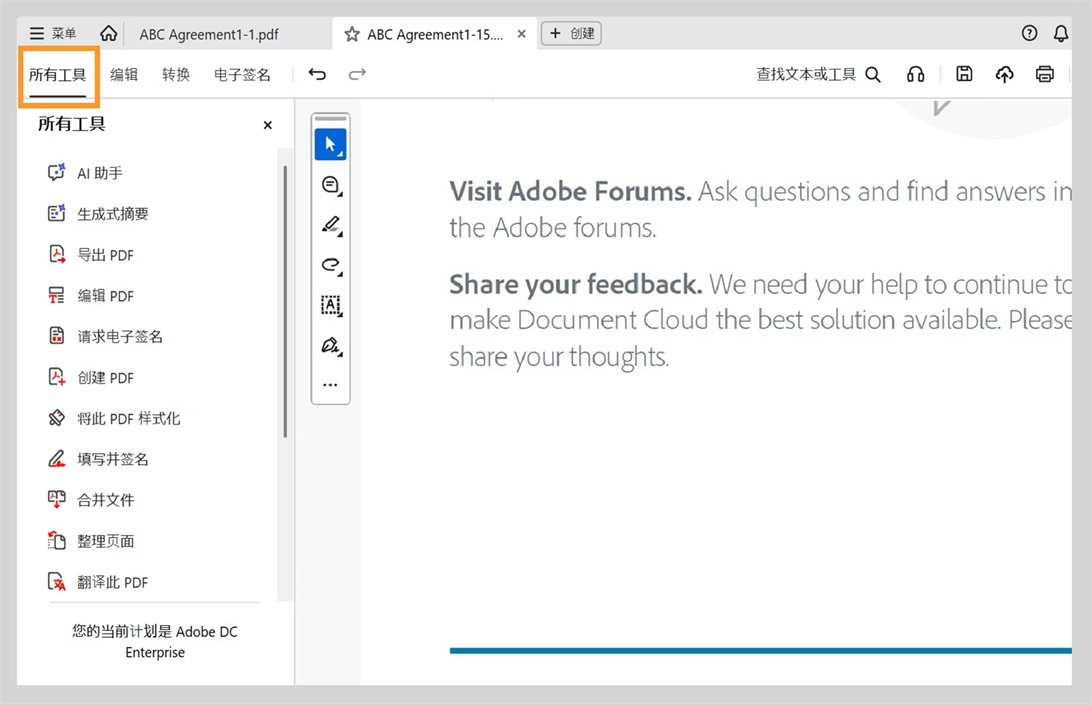 选择“所有工具”菜单,可从一个位置访问所有 Acrobat 工具。