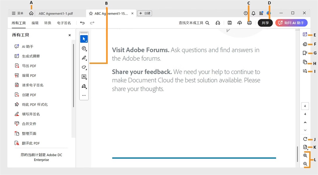 A. 主页 B. “快速操作”工具栏 C. 打印 D. 共享 E. 生成式摘要工具 F. 注释工具 G. 书签工具 H. 页面缩略图工具 I. 文章工具 J. 旋转页面 K. 页面显示设置 L. 放大/缩小