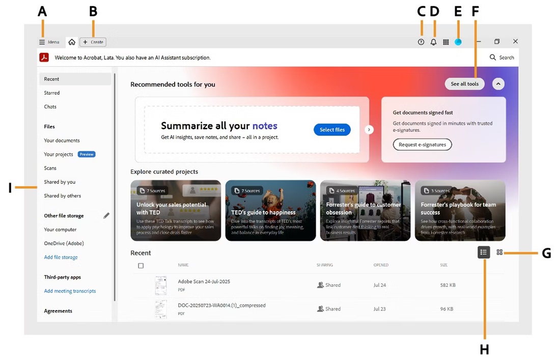 从主页视图,您可以访问:A. 应用程序菜单 B. 创建 PDF C. 帮助 D. 通知 E. Adobe 帐户 F. 所有工具 G. 列表视图 H. 缩略图视图 I. 主页菜单