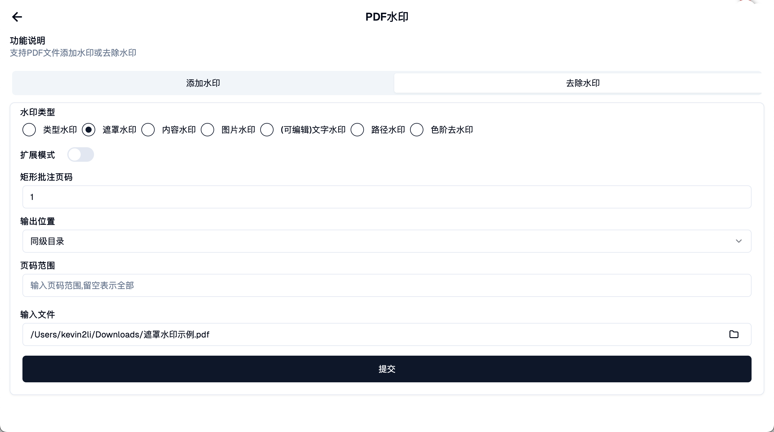 本软件支持多种去水印方式,适用于不同水印类型的PDF。