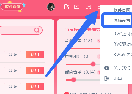 8、回到RVC变声器,点击右上角三横线标识,选择【选项设置】。