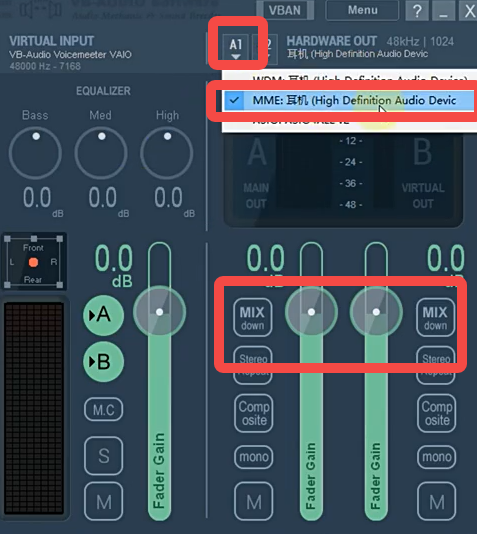 14、最后一个轨道也要调到0,然后A1这里一定要选择【MME:耳机】。