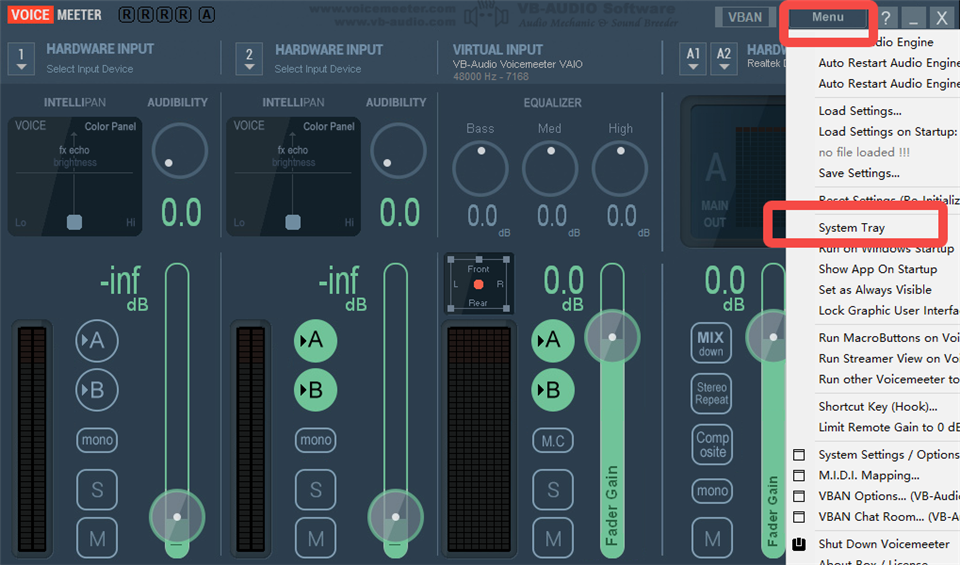 15、最后点击右上角【Menu】,选择【System Tray】,最小化到托盘。