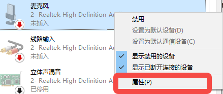 5、然后选择麦克风,右击选择【属性】。