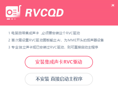 1、下载安装好RVC软件后,出现安装声卡弹窗,若使用电脑自带的声卡,则需要安装集成声卡RVC驱动;若使用专业独立声卡或已经安装过该驱动的,选择直接启动主程序。