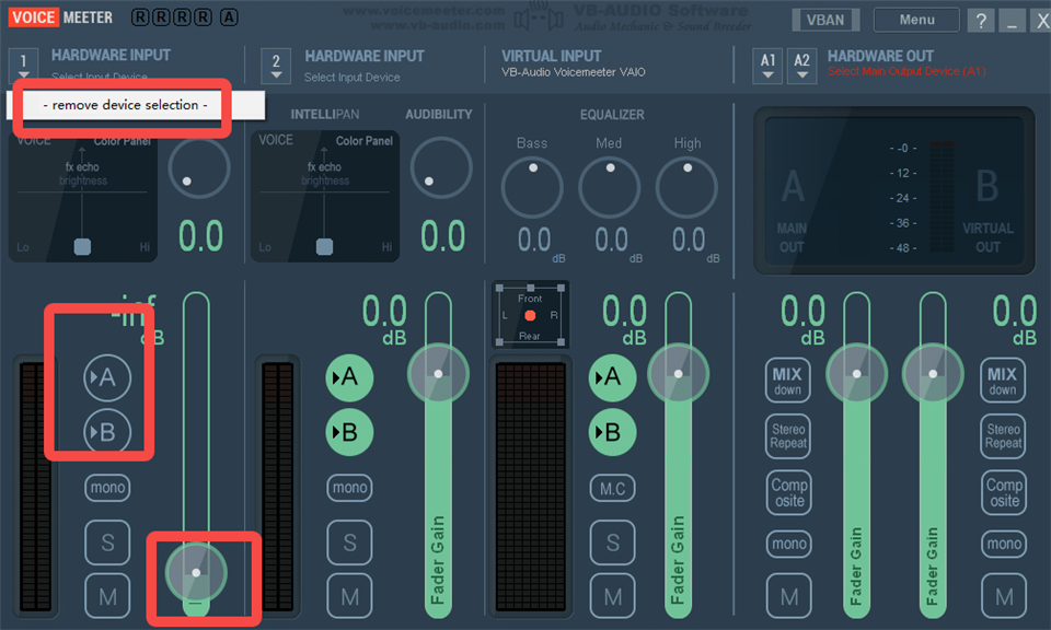 11、接下来设置RVC驱动面板,第一个通道是硬件的输出与监听,在使用本软件时,一般用不到,因此这里选择为空【remove device selection】,把A、B按钮都关掉,滑块拉到最低。