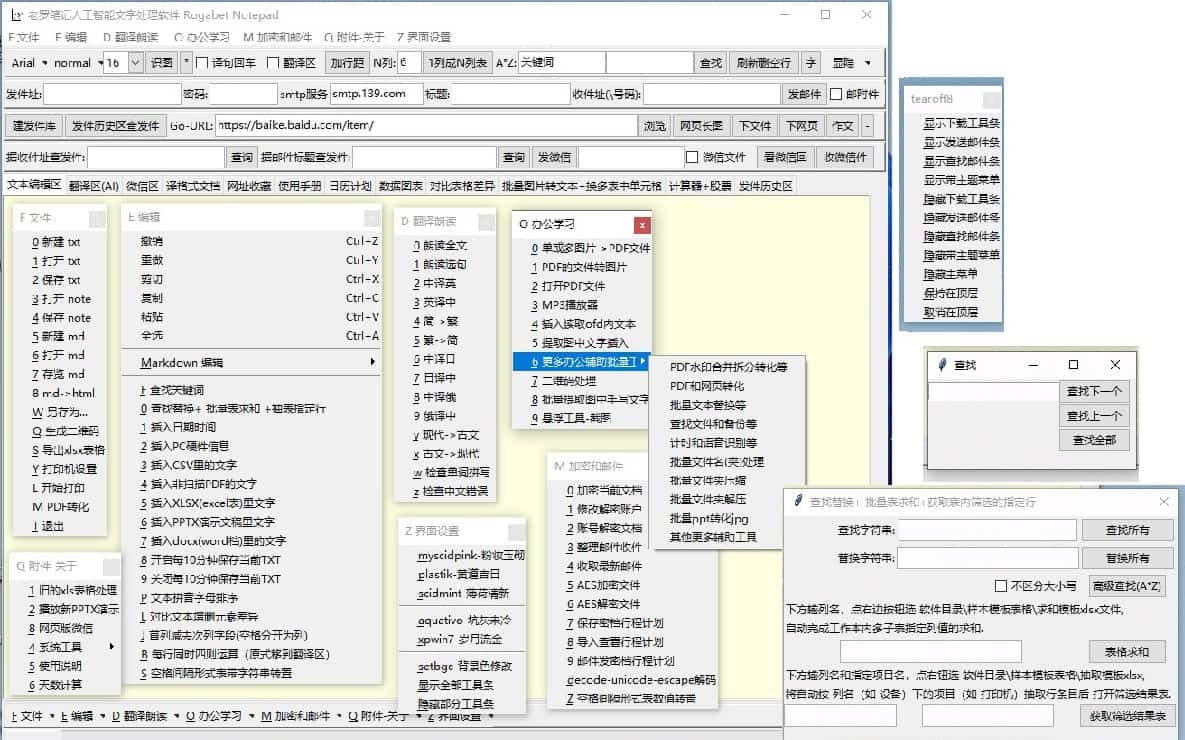其他:下网页或zip,找文件(文件内包含词\像素\文件名),批量图插入表,日历计划导出,解方程和函数图,网址收藏,批量压JPG和改尺寸等,aes加密和删除重复文件,批量word里词换图,查看剪贴板,文件名分类,横竖图片分类等.