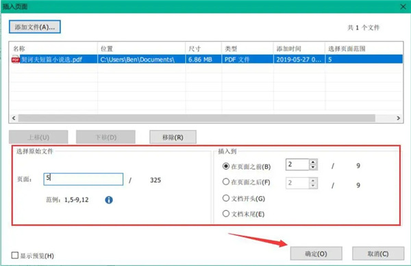 5、接下来,在福昕高级 PDF 编辑器弹出来的插入页面的设置中,用户设置需要合并的 PDF 具体的展现位置,设置完成后,点击“确定”按钮。