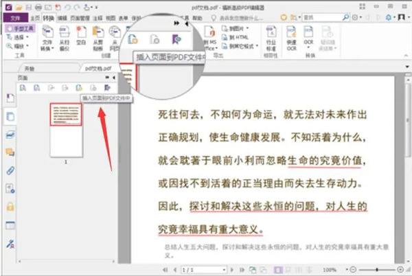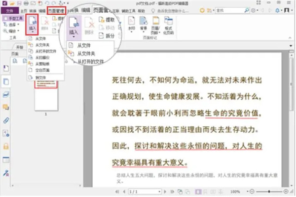 4、或者,你也可以点击福昕高级 PDF 编辑器菜单栏中的“页面管理”,在其功能栏中点击“插入”,再从“插入”子菜单中选择需要合并的 PDF 并进行排列。