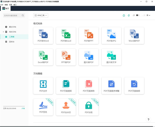 4、登入进去之后就可以使用了,在这里可以使用PDF转Word、Excel等等,往下滑还有很多。