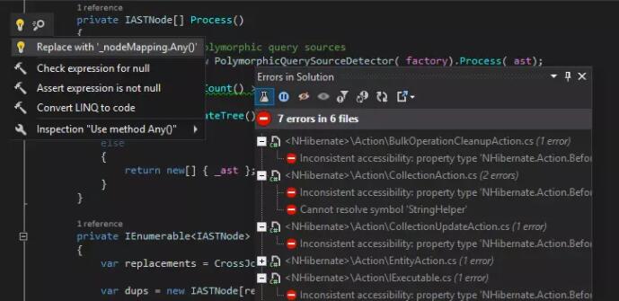 为了混合C#和VB.net项目,ReSharper帮助你保持代码的各个部分在一起流畅的工作和在你的代码间轻松的导航。所有导航和搜索动作把所有语言的代码都考虑在内,包括C#,VB.net,Asp.net,和XAML。你可以导航到使用,声明,继承,基类和更多—交叉语言。无论何时只要可能,都会由使用重构、上下文动作、或覆盖两个主要语言的快速修改进行自动引用修正。单元测试是可用的,并且无论使用C#或VB.net写单元测试都是一样的用。