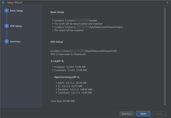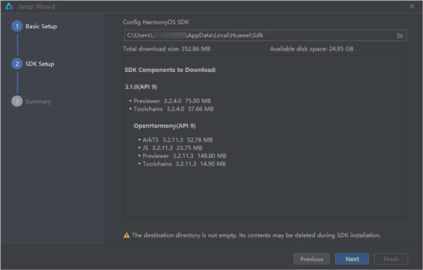 3、在SDK Setup界面,单击按钮,设置HarmonyOS SDK存储路径,单击Next进入下一步。